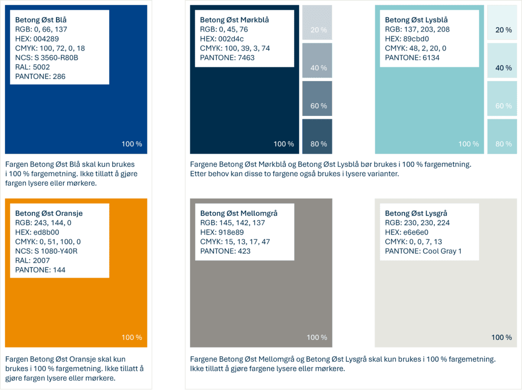 Fargene Betong Øst Blå og Betong Øst Oransje er hovedfarger – øvrige farger er støttefarger og skal brukes i begrenset grad.